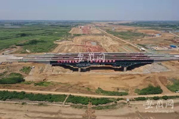 據介紹,淠河總干渠渡槽工程由中鐵四局和中國鐵建大橋局聯(lián)合承建,是引江濟淮重大節(jié)點工程。渡槽總長 350 米,分左右兩幅,其中鋼渡槽全長246 米,總用鋼量達 2.1 萬噸。設計流量150立方米每秒,設計水深4.0米,為Ⅵ級航道,通行100噸級船舶。橋跨布置采用 68 米 +110米 +68 米的三跨鋼結構桁架式梁拱組合設計,主跨跨度達 110 米,是目前世界上單跨最大的通水通航鋼結構渡槽。渡槽下部為引江濟淮Ⅱ級航道,兩航道高差約30米。