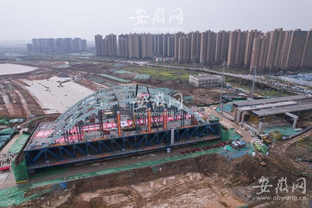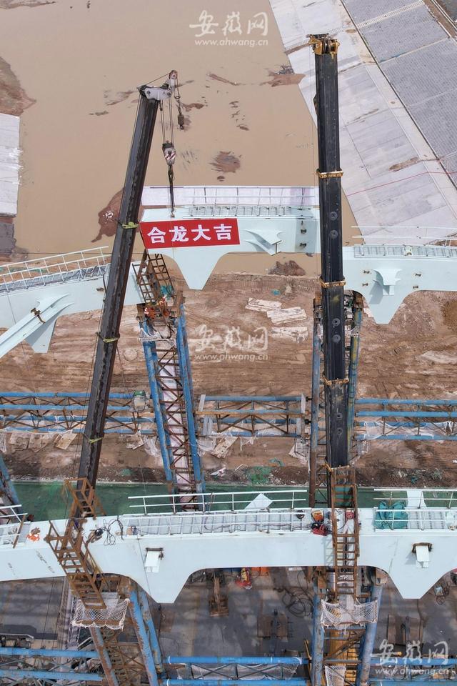 3月27日上午10點(diǎn)多,新安晚報(bào)、安徽網(wǎng)、大皖新聞記者在引江濟(jì)淮繁華大道橋工程現(xiàn)場看到,主橋拱肋經(jīng)過吊裝、固定、焊接等流程后,完成了合龍段的施工。